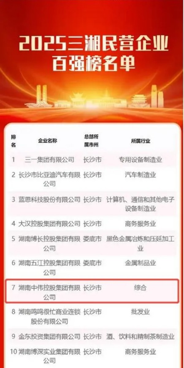 12月18日,2025三湘民营企业百强榜在长沙正式发布。中伟集团凭借持续稳健的经营表现与产业创新实力,位列榜单第七位,排名较去年提升两位。
